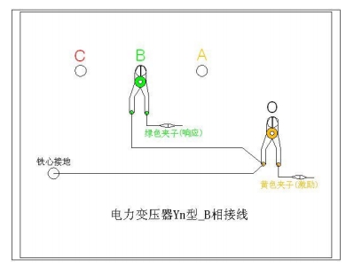 B相測量接線:1. 測量系統共一點接地,取變壓器鐵芯接地。2. 黃夾子定義為輸入,鉗在Yn 的‘O’點、綠夾子定義為測量,鉗在 B 相上。3. 地線連接網依次由綠夾子地線孔插入接地線至黃夾子地線孔,再連接一接地線到鐵芯接地。