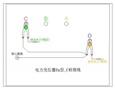 C相測量接線:1. 測 量 系 統 共 一 點 接地,取變壓器鐵芯接地。2. 黃夾子定義為輸入,鉗在 Yn 的‘O’點、綠夾子定義為測量,鉗在 C 相上。3. 地線連接網依次由綠夾子地線孔插入接地線至黃夾子地線孔,再連接一接地線到鐵芯接地。