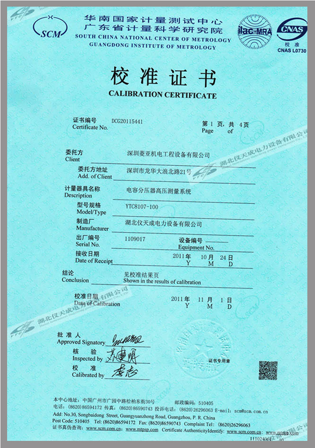 轉載:"YTC8107系列電容分壓器高壓測量系統鑒定證書" 請注明來源于儀天成電力。 更多技術問題請致電儀天成電力客戶服務:027-87876585,技術部專線:027-87876585,在線客服:719388481